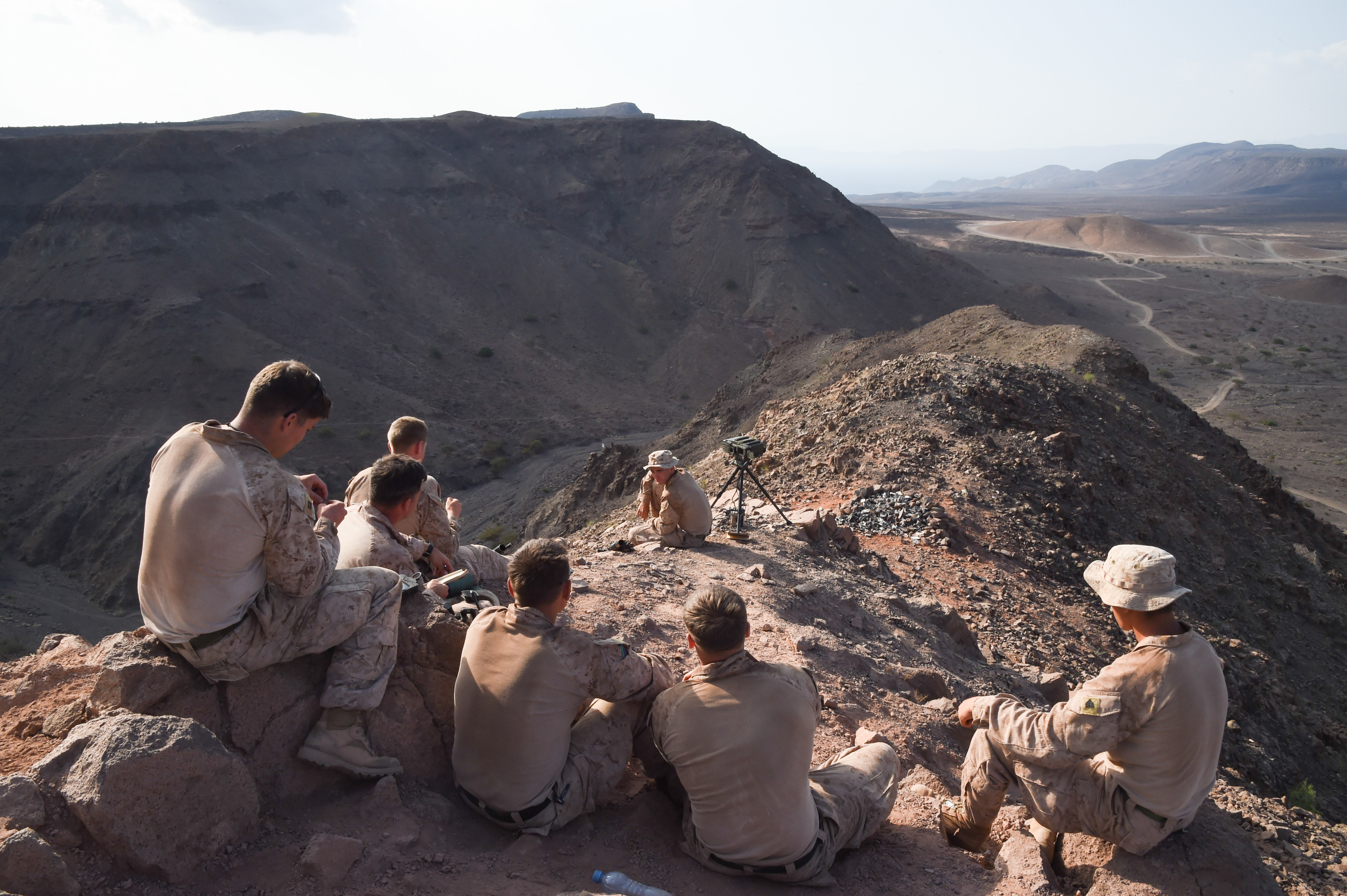 U.S. Marine Corps members with 1st Air Naval Gunfire Liaison Company (ANGLICO), 11th Marine Expeditionary Unit (MEU), wait to communicate with players during a helo-borne raid on the range during Exercise Alligator Dagger, Dec. 18, 2016, at Arta Plage, Djibouti. The exercise allows opportunities for the 11th MEU to maintain their respective skills and proficiencies while intermittently participating in bilateral training with the French. (U.S. Air National Guard photo by Staff Sgt. Penny Snoozy)