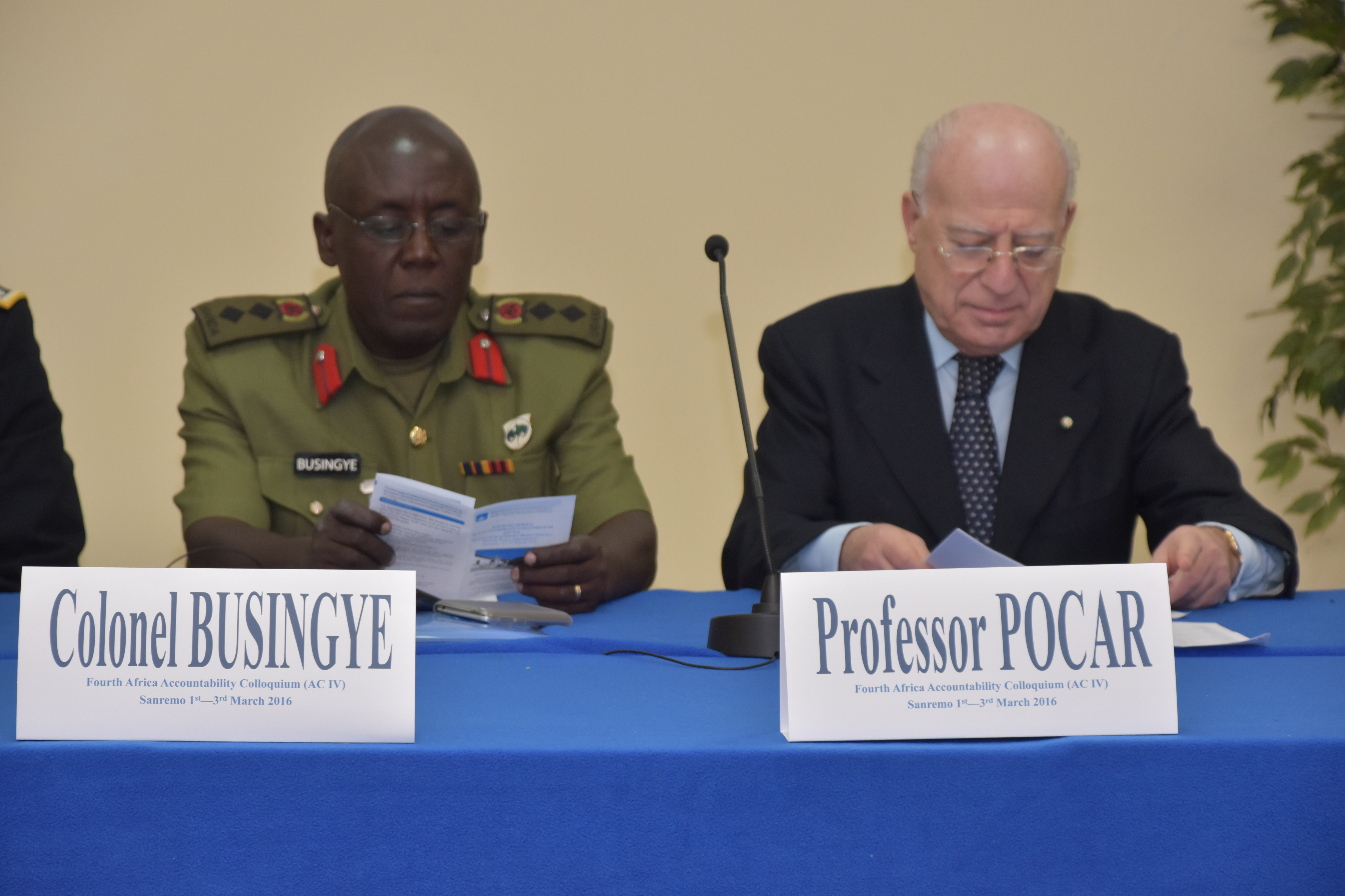Deputy Chief of Legal Services for the Uganda Peoples’ Defence Forces, Col. Godard Busingye, (left), and President of the International Institute of Humanitarian Law (IIHL), Prof. Fausto Pocar at the U.S. AFRICOM’s Fourth Africa Accountability Colloquium (ACIV) on “Responding to Gender Based Violence During Peace Operations.” Nearly 40 military legal professional and commanders from 20 African countries have come together in an effort to lay the foundation for responding to sexual violence allegations that occur during peacekeeping operations. The annual event is once again being hosted by the International Institute of Humanitarian Law (IIHL) in Sanremo, Italy, Mar. 1-3, 2016. (U.S. Africa Command photo by Brenda Law/RELEASED)