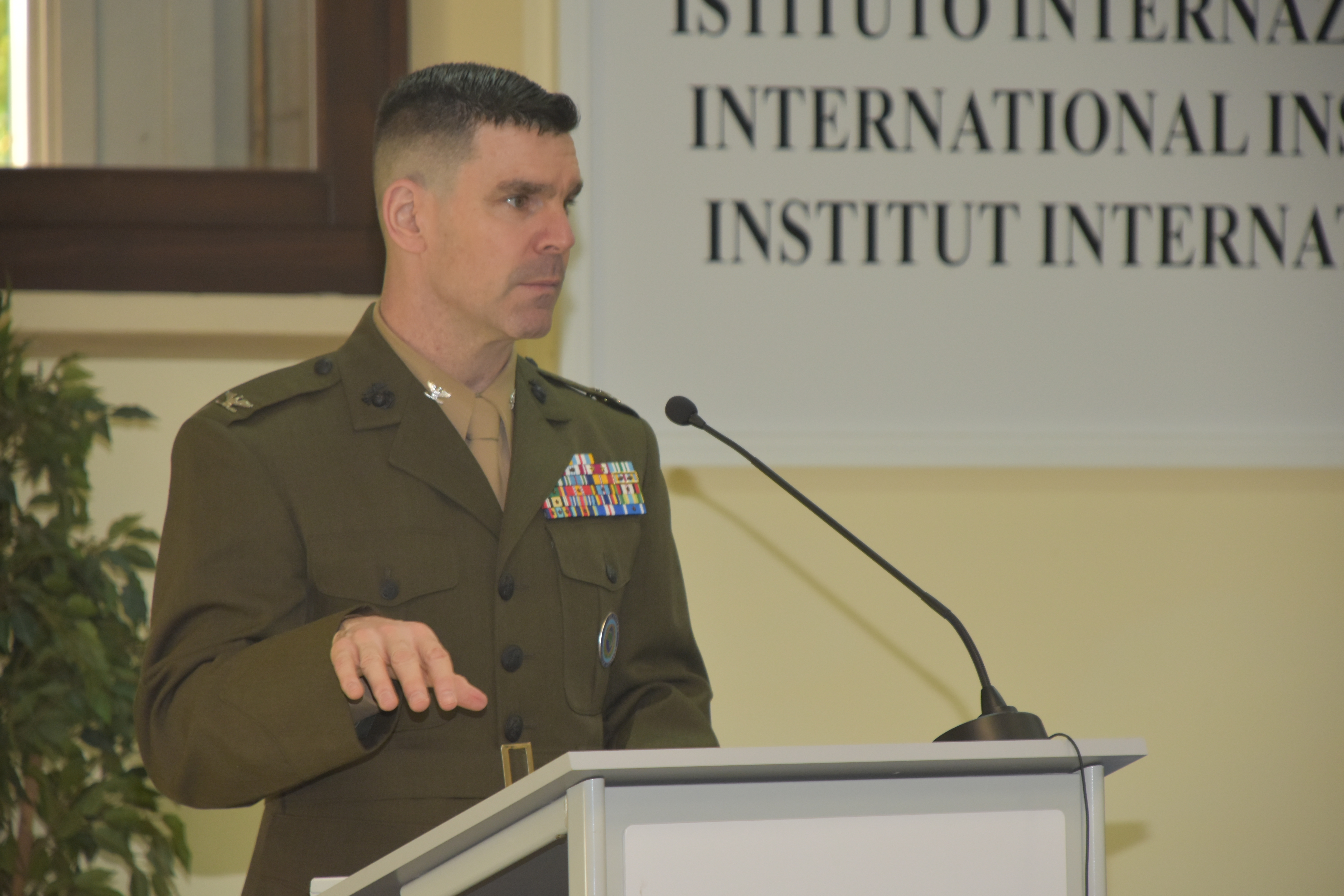 Legal Counsel to the Commander, U.S. Africa Command, U.S. Marine Col. Donald Riley delivers comments at AFRICOM’s Fourth Africa Accountability Colloquium (ACIV) on “Responding to Gender Based Violence During Peace Operations.” Nearly 40 military legal professional and commanders from 20 African countries have come together in an effort to lay the foundation for responding to sexual violence allegations that occur during peacekeeping operations. The annual event is once again being hosted by the International Institute of Humanitarian Law (IIHL) in Sanremo, Italy, Mar. 1-3, 2016. (U.S. Africa Command photo by Brenda Law/RELEASED)