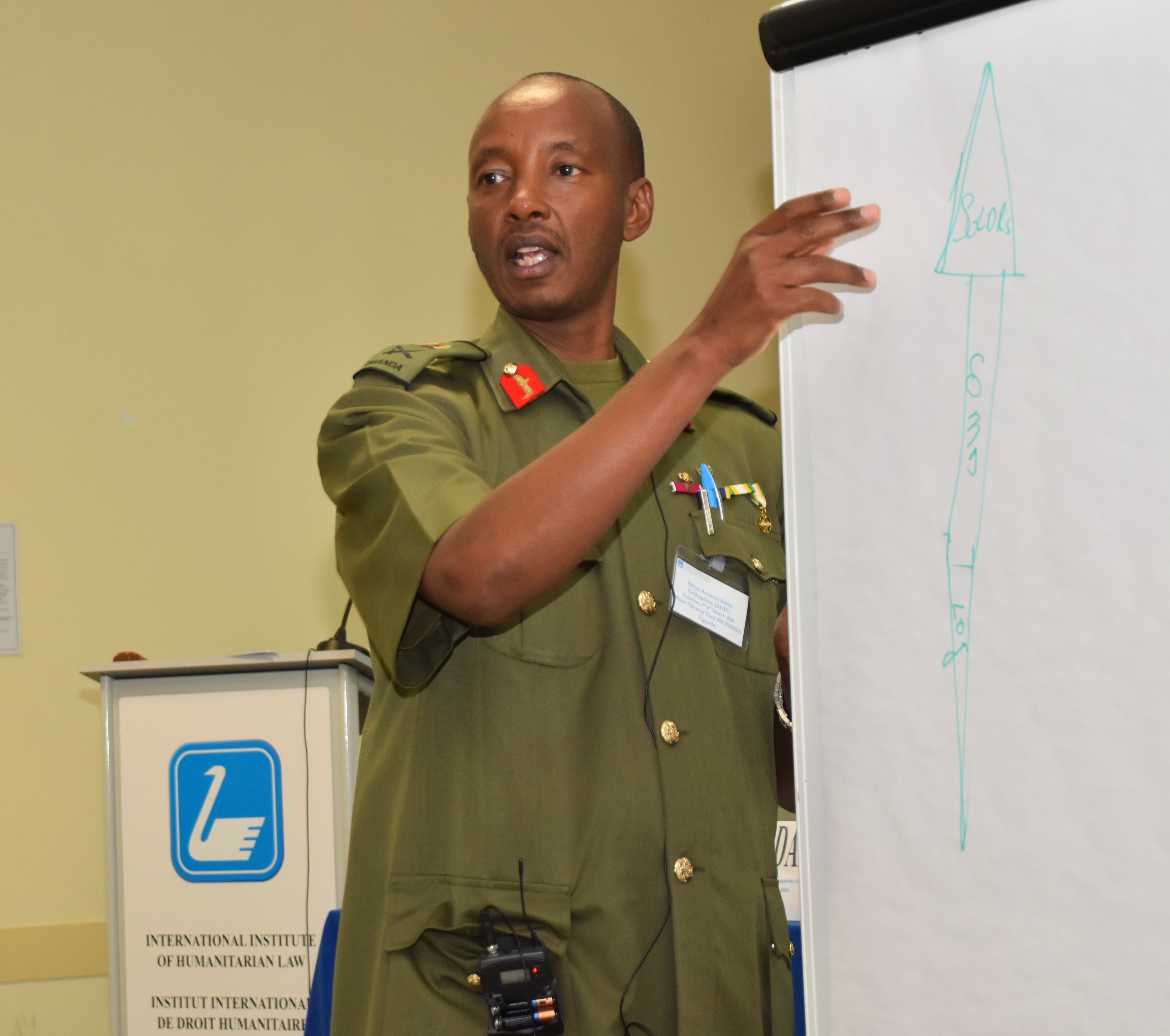 Former African Union Mission in Somalia (AMISOM) Commander, Maj. Gen. Fred Mugisha draws an African spear as an analogy to describe the challenge of executing peace operations where multiple systems of law are in use, and soldiers require the support of their command in confronting extraordinary logistical challenges." Mugisha delivered the keynote address at the U.S. AFRICOM’s Fourth Africa Accountability Colloquium (ACIV) on “Responding to Gender Based Violence During Peace Operations.” Nearly 40 military legal professional and commanders from 20 African countries have come together in an effort to lay the foundation for responding to sexual violence allegations that occur during peacekeeping operations. The annual event is once again being hosted by the International Institute of Humanitarian Law (IIHL) in Sanremo, Italy, Mar. 1-3, 2016. (U.S. Africa Command photo by Brenda Law/RELEASED)