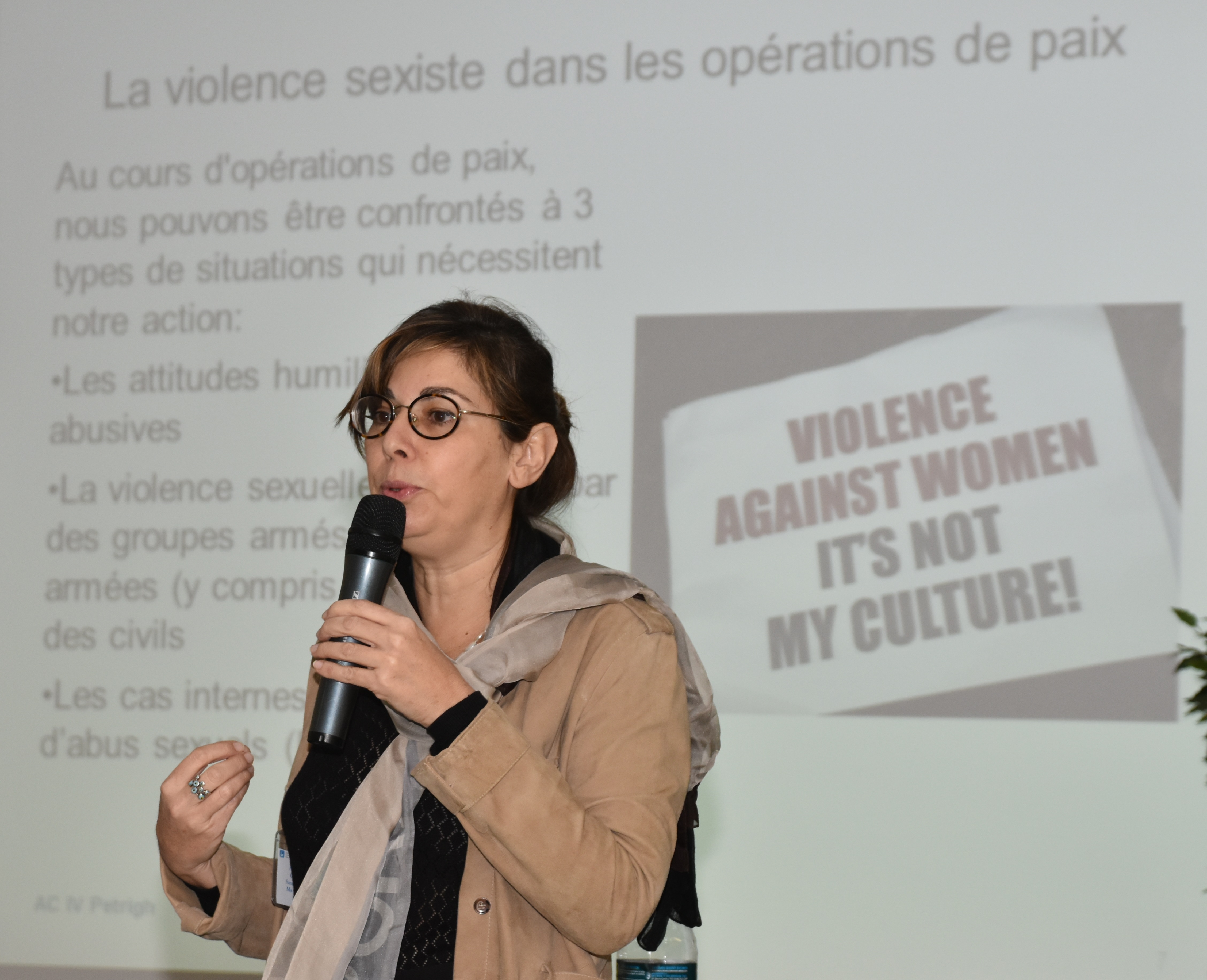 Cynthia Petrigh, from Beyond Peace, discusses gender based violence at U.S. AFRICOM’s Fourth Africa Accountability Colloquium (ACIV) on “Responding to Gender Based Violence During Peace Operations.” Nearly 40 military legal professional and commanders from 20 African countries have come together in an effort to lay the foundation for responding to sexual violence allegations that occur during peacekeeping operations. The annual event is once again being hosted by the International Institute of Humanitarian Law (IIHL) in Sanremo, Italy, Mar. 1-3, 2016. (U.S. Africa Command photo by Brenda Law/RELEASED)