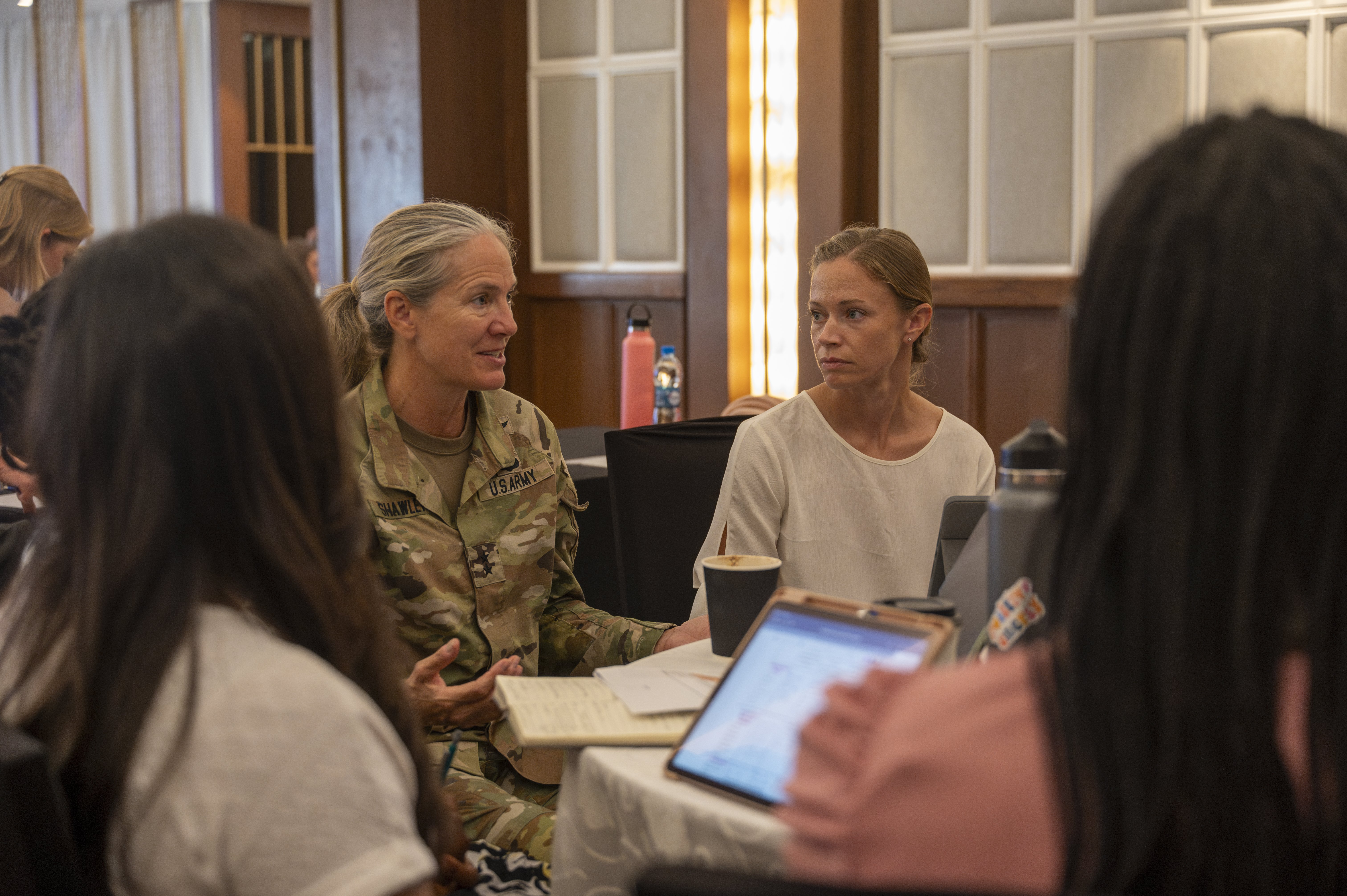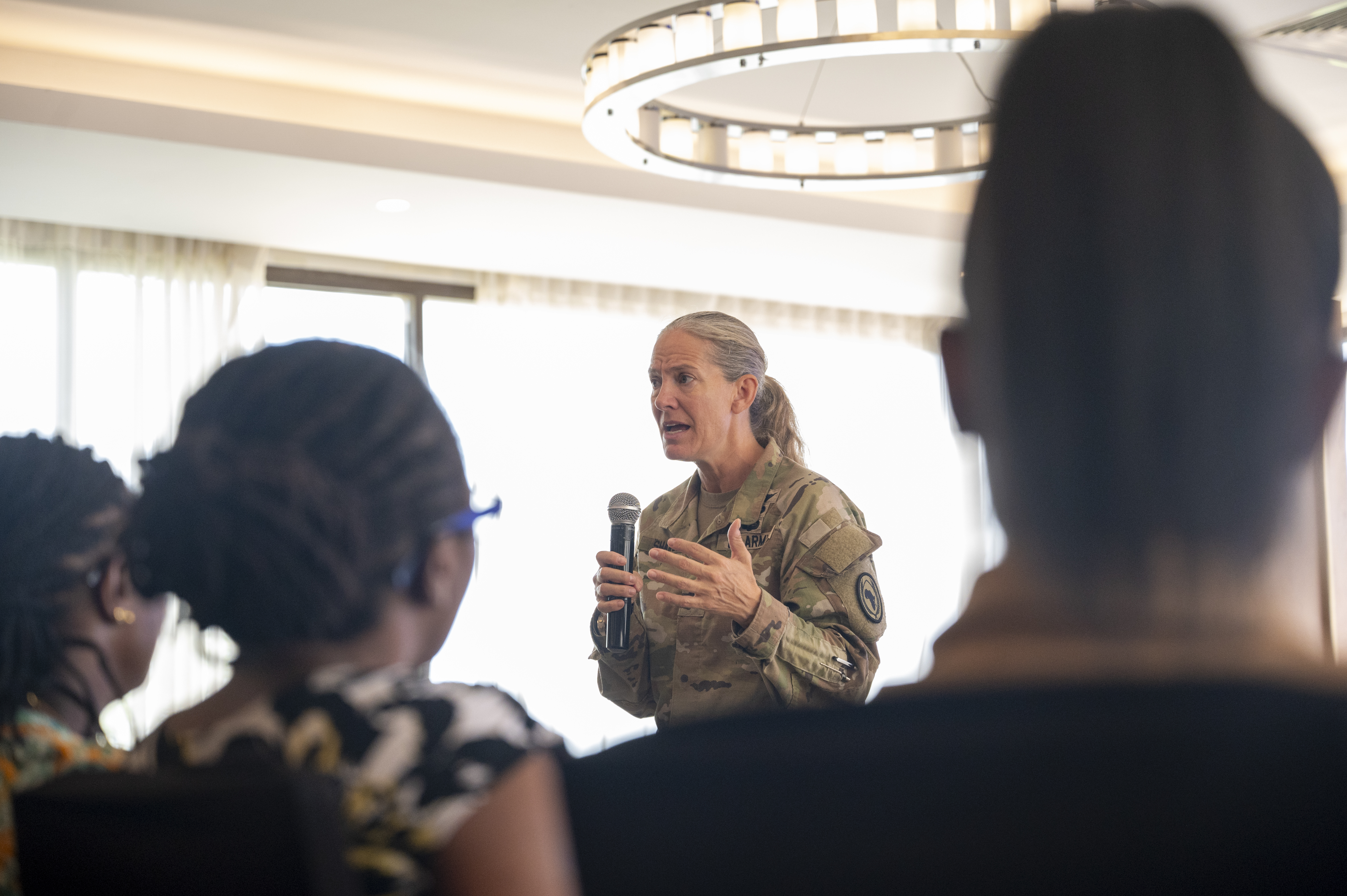 U.S. Army Maj. Gen. Jami Shawley, CJTF-HOA commanding general, joins a group of U.S. service members as they discuss ways to more proactively integrate WPS in their operational environment at the Sheraton Hotel, Djibouti, Sept. 26, 2023. During the class, men and women from all branches of service and backgrounds led discussions on how to make their workplace more secure and accepting of different gender perspectives. (U.S. Army National Guard photo by Sgt. Jalen Miller)