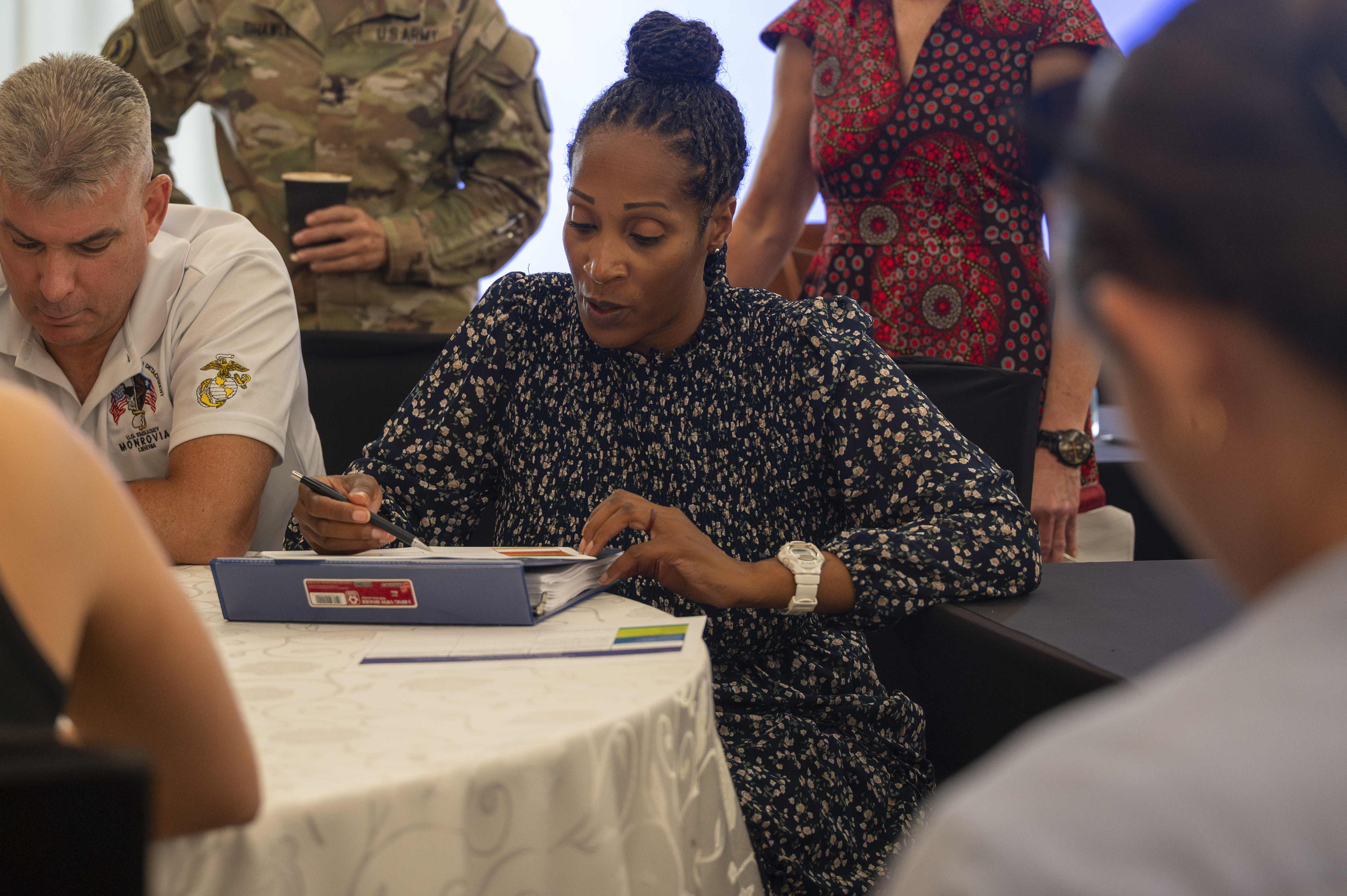 U.S. Army Col. Antionette Mulholland, Combined Joint Task Force - Horn of Africa logistics director, takes notes during a group discussion for her Women, Peace, and Security level 100 course at the Sheraton Hotel, Djibouti, Sept. 26, 2023. Mulholland discussed the importance of bringing in different gender and racial perspectives in the armed forces. (U.S. Army National Guard photo by Sgt. Jalen Miller)