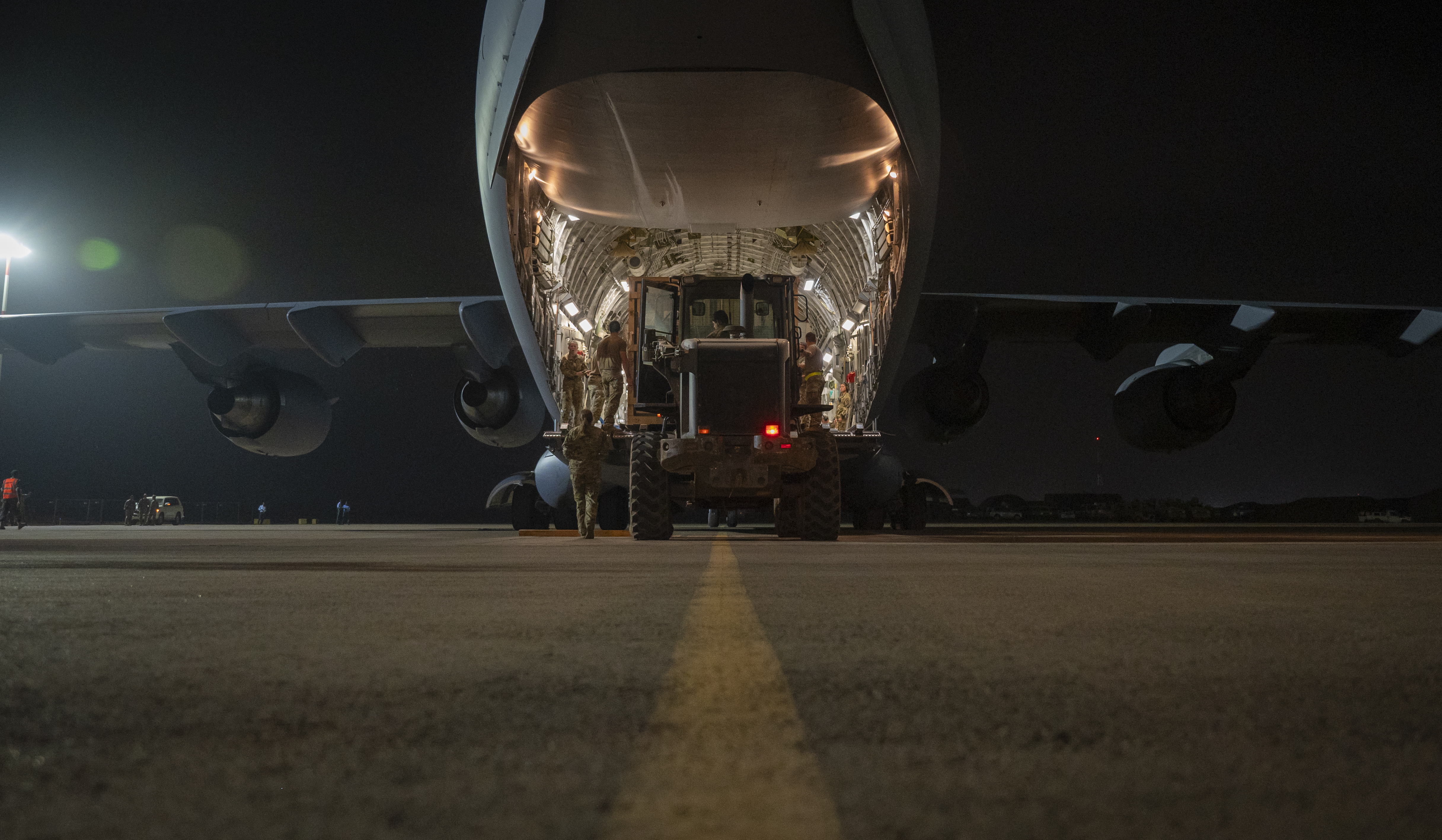 A U.S. Air Force C-17 Globemaster III taxis down the runway following a ceremony marking the official turnover of the U.S. compound at Air Base 101 in Niamey, Niger. This Nigerien base has housed U.S. personnel and assets to help counter violent extremist organizations in the region. With the closure of the U.S. compound on Air Base 101, U.S. forces will now focus on completing the withdrawal from Air Base 201 in Agadez.