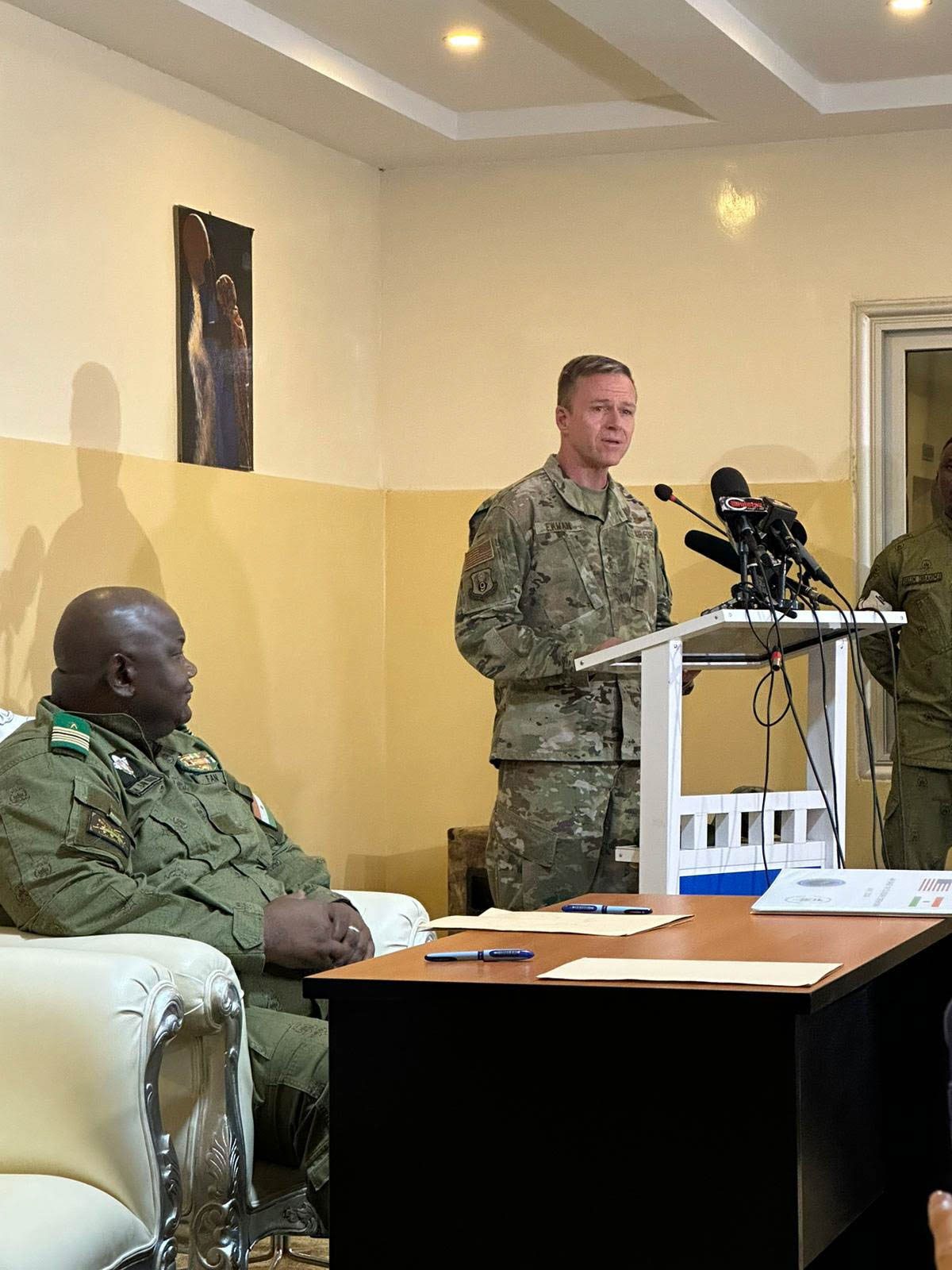 Maj. Gen. Kenneth Ekman, U.S. Africa Command Director for Strategy, Engagement and Programs (J5) and Colonel Major Mamane Sani Kiaou, Nigerien Chief of Army Staff, address the media during a ceremony marking the official turnover of the U.S. compound on Air Base 101 in Niamey. This Nigerien base has housed U.S. personnel and assets to help counter violent extremist organizations in the region. With the closure of the U.S. compound on Air Base 101, U.S. forces will now focus on completing the withdrawal from Air Base 201 in Agadez.