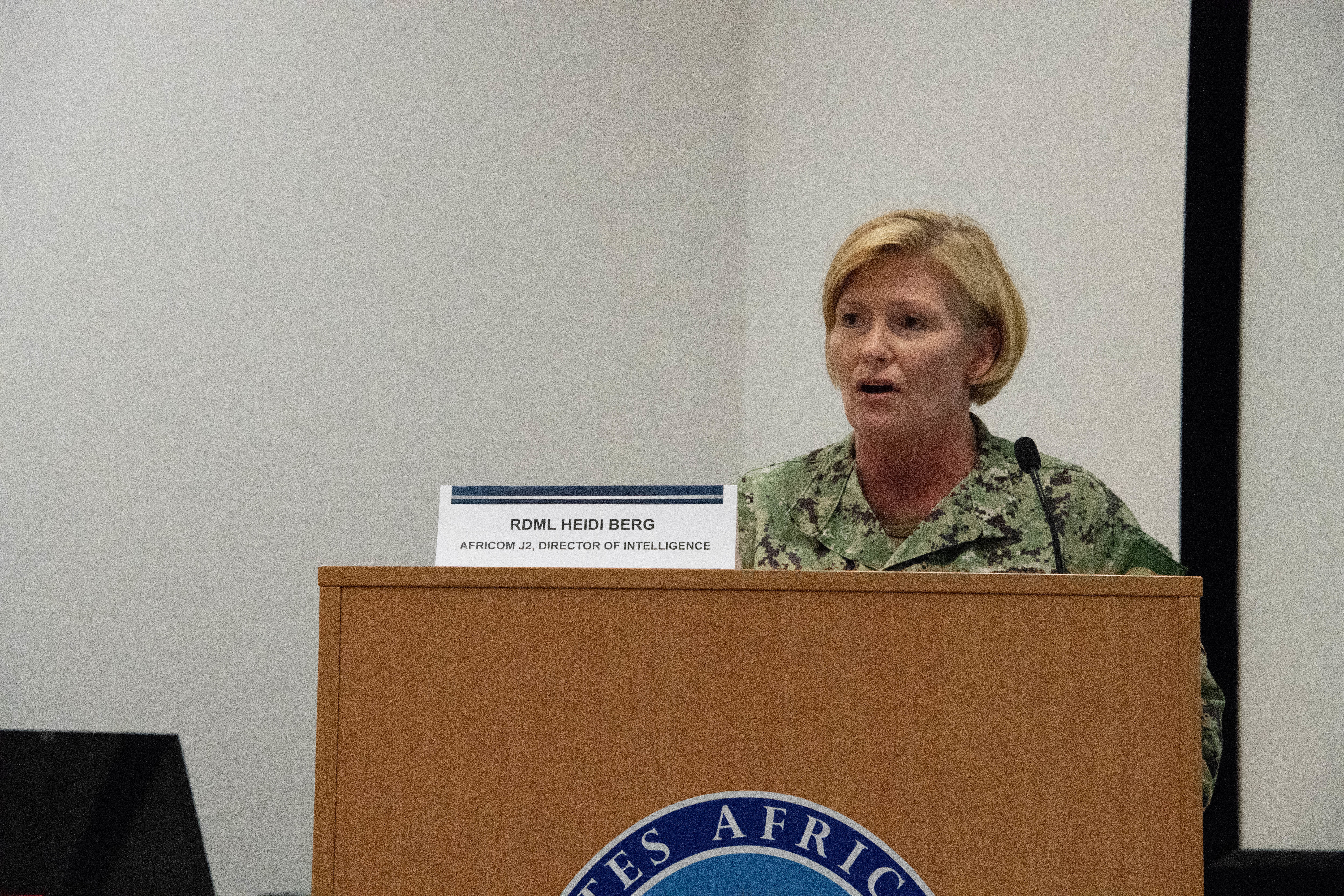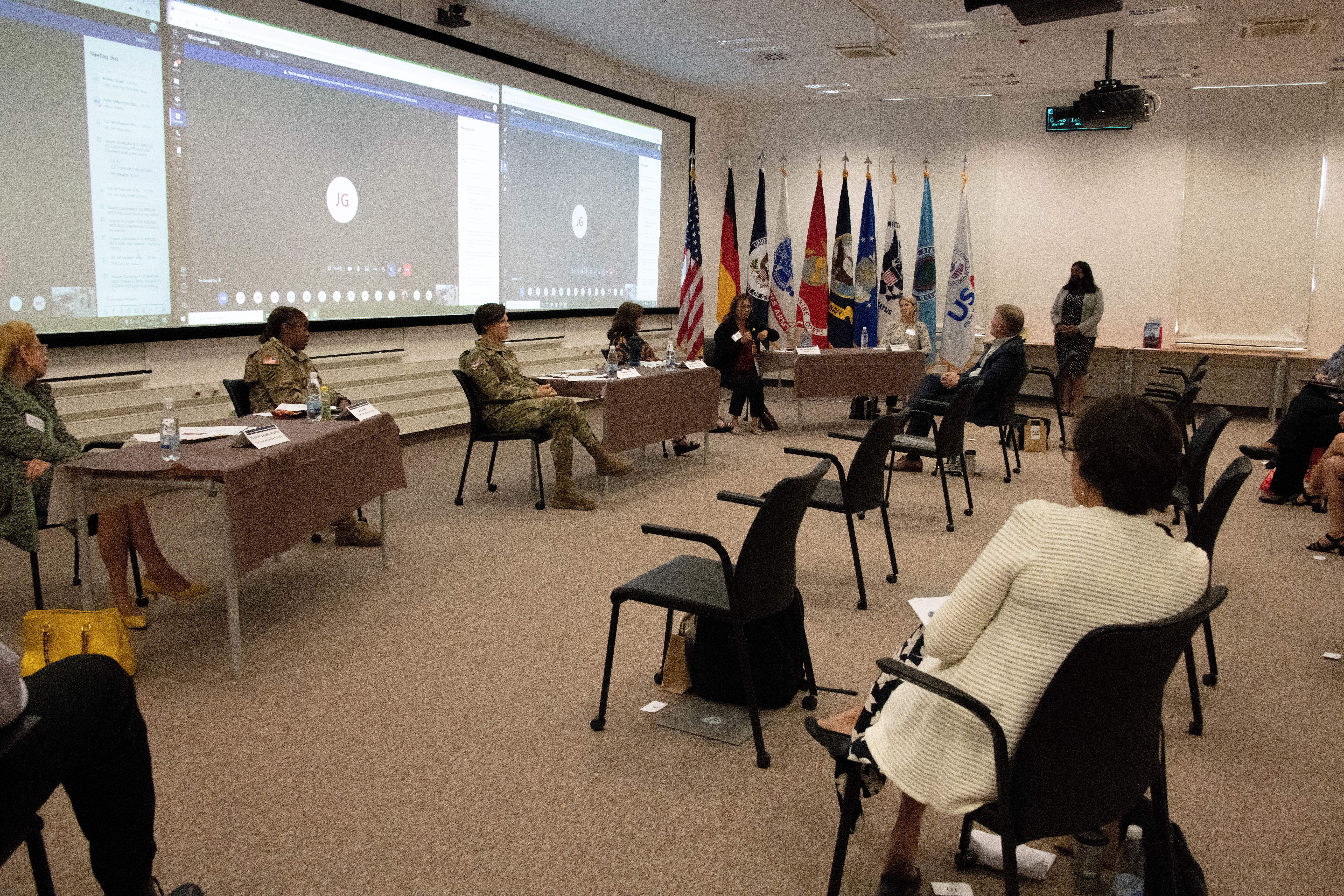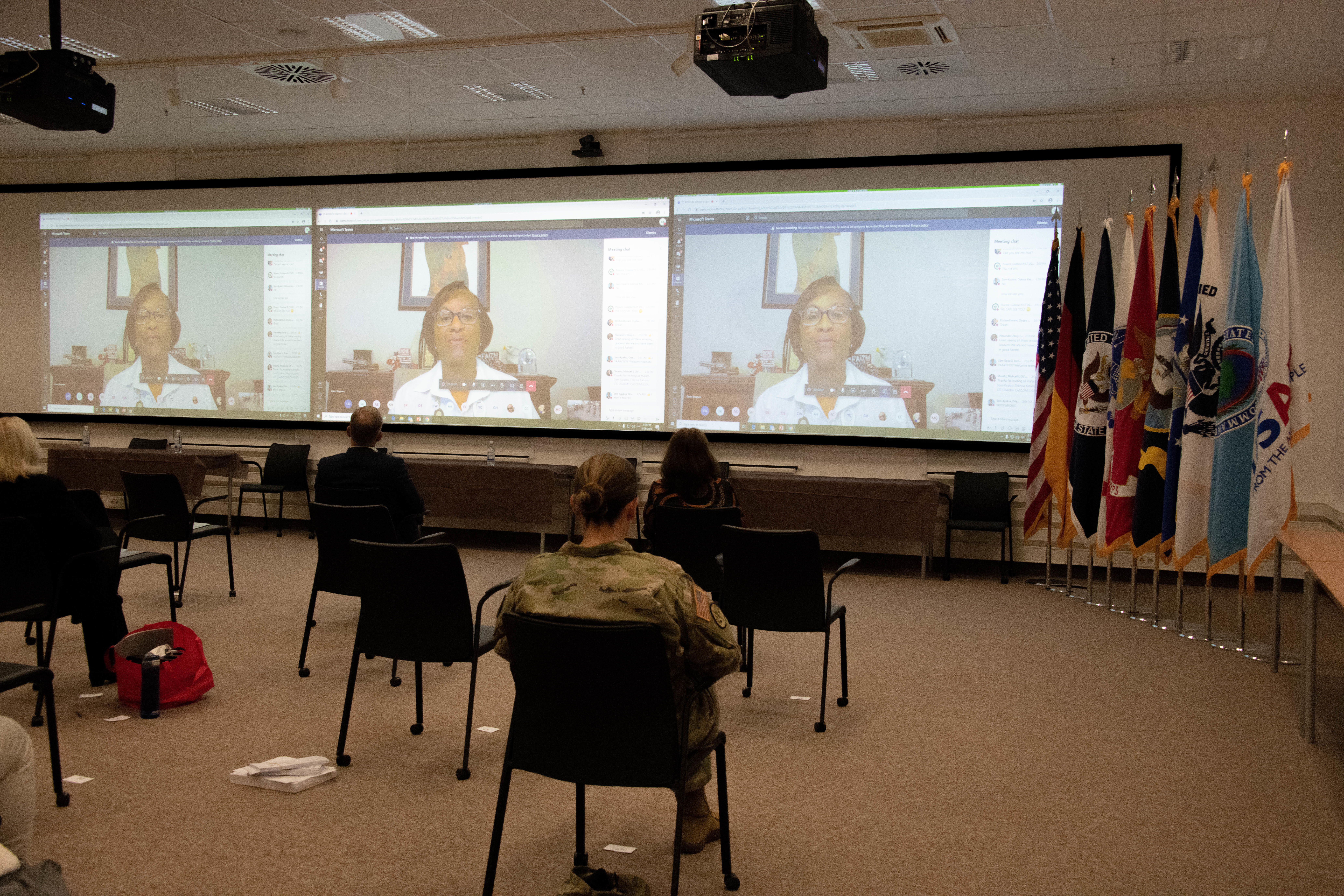 STUTTGART, Germany—Col. Jeffrey M, Schroeder (left), director, command control, communications, and computer systems, and Col. Gretchen Nunez (right), director, joint cyber center, U.S. Africa Command, listen to their African nation counterparts as they discuss cybersecurity during COVID-19, U.S. African Stuttgart, Germany, August 5, 2020. The two-day course included African partners from Uganda, Botswana, Ghana, Kenya, and Morocco. (Photo by U.S. Army Staff Sgt. Flor Gonzalez, Public Affairs, U.S. Africa Command)