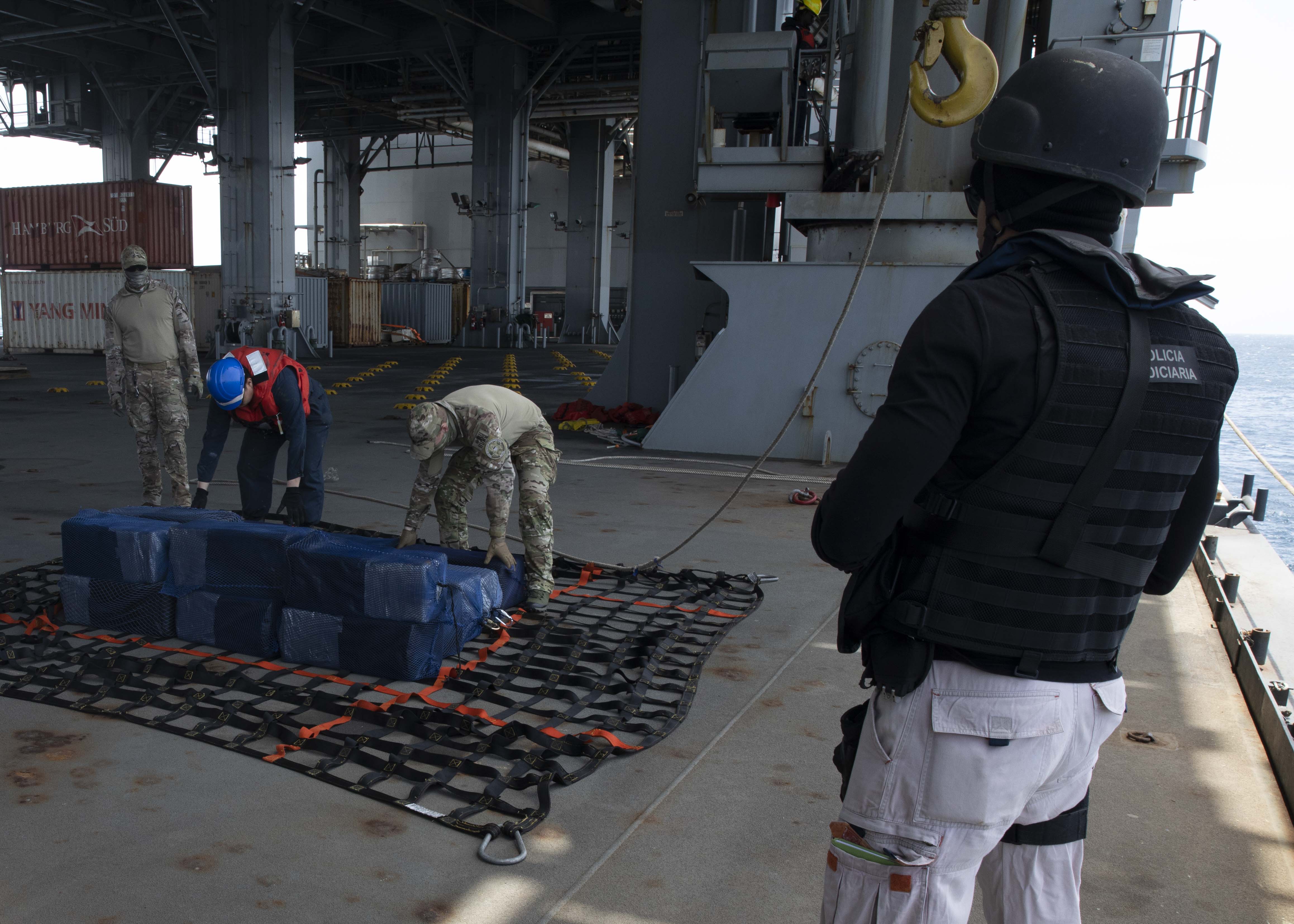 A second fishing vessel boarding on April 1, with Cabo Verde law enforcement authorities, resulted in the seizure of approximately six and a half tons of suspected cocaine with an estimated street value at more than $350 million, marking one of the largest non-containerized, trans-oceanic drug seizures in recent memory. Cabo Verde law enforcement authorities took seven individuals into custody during the counter-drug operation.