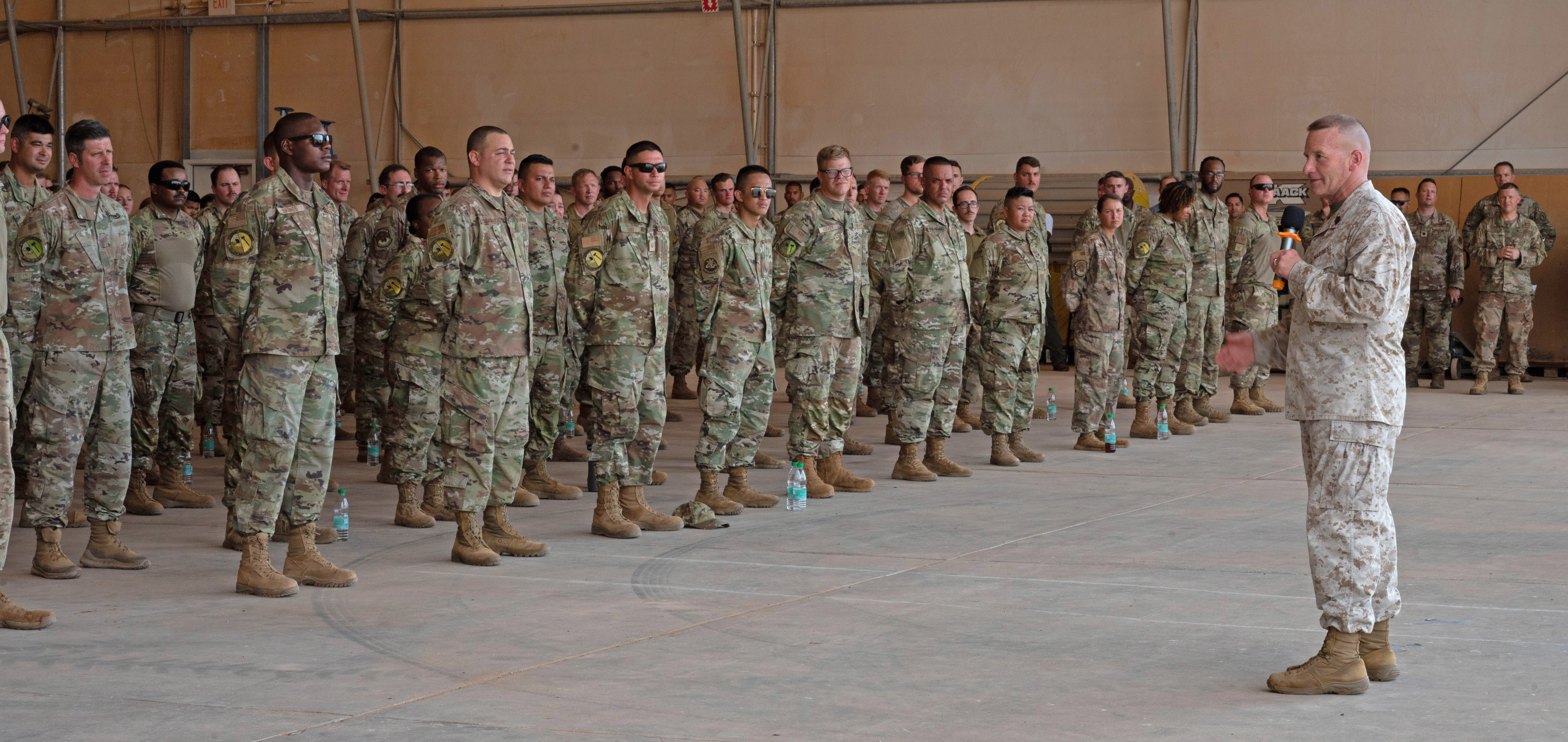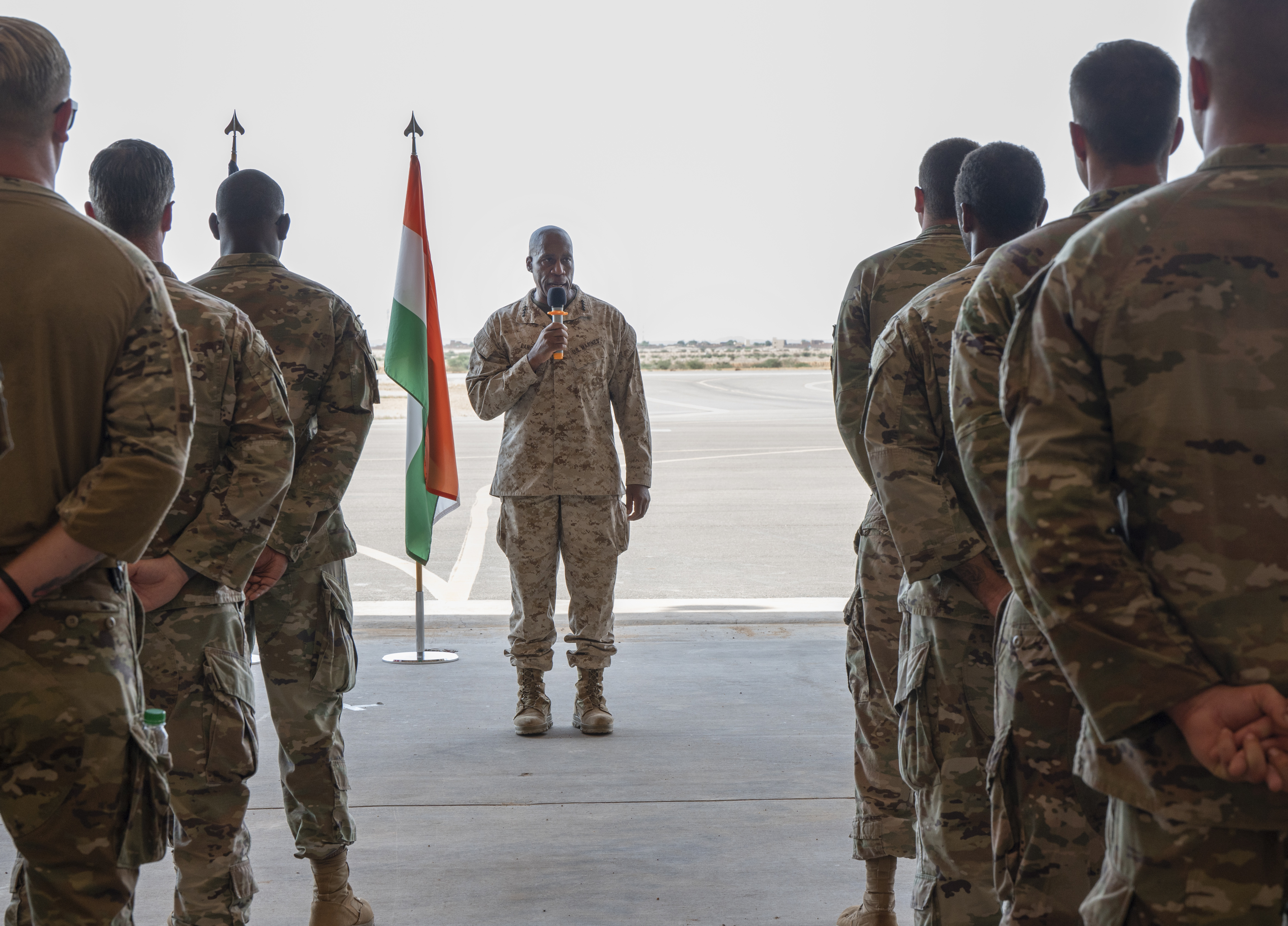 U.S. Marine Corps Michael Langley, U.S. Africa Command commander, speaks to Airmen and Soldiers stationed at Nigerien Air Base 201, Niger, during his visit, Sept. 18, 2022. The visit here was one stop on a three-day trip to Niger and Chad from Sept. 18-21, Langley's second trip to Africa since taking command of U.S. Africa Command on Aug. 9.