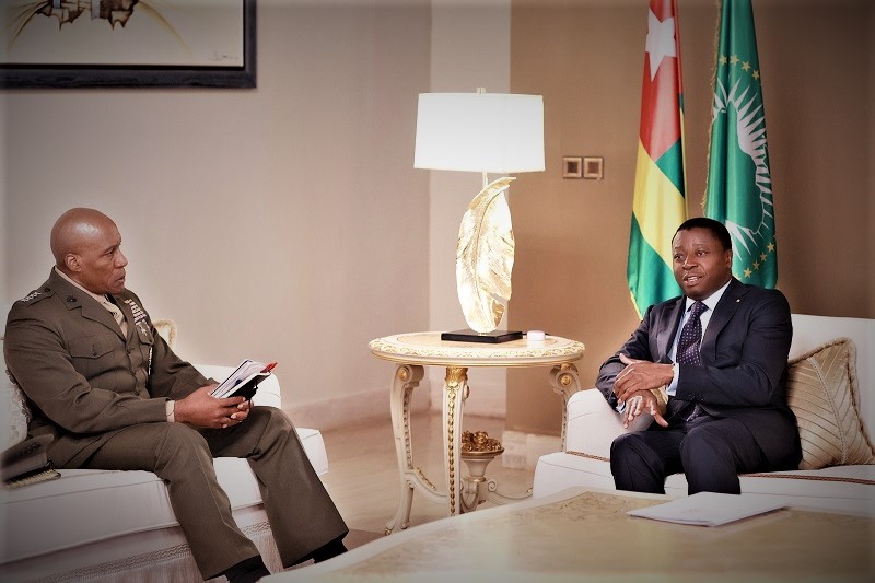 Au cours de la deuxième étape du voyage au Togo, l'équipe de direction de l'AFRICOM et l'ambassadrice des États-Unis au Togo, Elizabeth Fitzsimmons, ont rencontré le Président Gnassingbé, le Chef d'état-major général des Forces Armées, le Général Tassounti Djato, et le Ministre de la Sécurité et de la protection civiles, le Général Damehame Yark. Ils ont discuté du leadership du Togo en matière de sécurité maritime et des efforts pangouvernementaux pour renforcer la sécurité régionale.