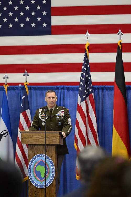 SGM Garric M. Banfield, U.S. Africa Command incoming Command Senior Enlisted Leader, speaks during his Change of Responsibility ceremony with SgtMaj Michael P. Woods at Kelley Barracks in Stuttgart, Germany, on Nov. 20, 2025. The ceremony is significant because it reinforces AFRICOM’s commitment to strong enlisted leadership and continued stability, readiness, and partnership across the African continent. (U.S. Africa Command Photo by Jason Johnson)