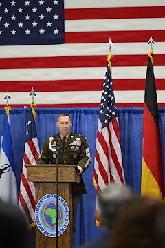 Gen. Dagvin Anderson, U.S. Africa Command Commander speaks during AFRICOM's Command Senior Enlisted Leader Change of Responsibility ceremony at Kelley Barracks in Stuttgart, Germany, on Nov. 20, 2025. The ceremony formally transitions senior enlisted leadership from U.S. Marine Corps Sergeant Major Michael P. Woods to U.S. Army Sergeant Major Garric M. Banfield. (U.S. Africa Command Photo by Jason Johnson)