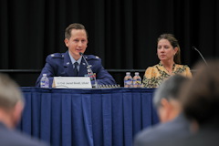 U.S. Air Force Lt. Col. Jared Bindl, chief of science, technology and innovation at U.S. Africa Command speaks during the Joint Warfighter Innovation at the Edge breakout session of the 2025 Emerging Technologies for Defense Conference, in Washington, D.C. August 28, 2025. (courtesy photo, National Defense Industrial Association)