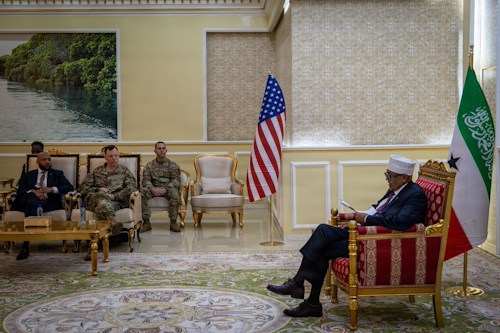 U.S. Air Force Gen. Dagvin Anderson, commander, U.S. Africa Command (AFRICOM), meets with President Abdirahman Mohamed Abdullahi, president of Somaliland, in Hargeisa, Somaliland, Nov. 26, 2025. The meeting was part of Gen. Anderson’s trip in East Africa to meet with government and defense leaders to strengthen America’s strategic approach to confronting terrorism through mutual engagement, stronger cooperation, and aligned security priorities. (U.S. Army photo by Cpt. Ubon Mendie)